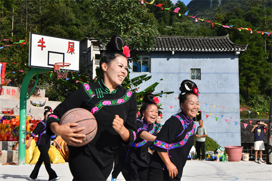 哨聲剛落,穿著黑色苗裝、額前發(fā)髻插著一朵紅花的姑媽舅媽們立馬“變身”運動員,抱著籃球樂呵呵往籃下沖。投中一個球就有人遞上瓶礦泉水當(dāng)“彩頭”。場上跑著笑著,你搶我傳;場下老人們大吹奏蘆笙,唱苗歌,娃娃們追著球跑,歡呼聲、笑聲裹著蘆笙調(diào)飄滿山谷,整個牛屎寨成了歡樂的海洋。20分鐘比賽結(jié)束,滿頭大汗的舅媽顧榜橋還意猶未盡:“托黨和政府的福,咱農(nóng)村日子越來越甜!頭回用‘姑媽籃球賽’慶新中國76歲生日,開心得很,有意義得很!”