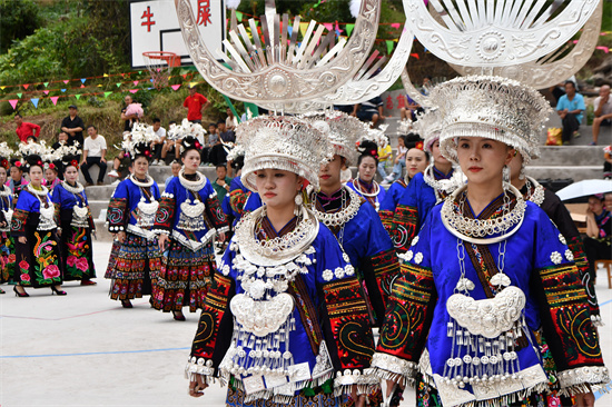 慶典這天,80多位姑媽穿著盛裝回了家,銀冠上的流蘇隨著腳步晃,圍著新球場跳蘆笙舞、唱苗歌,歌聲飄到山谷里,引得溪邊的水鳥撲棱著翅膀飛。