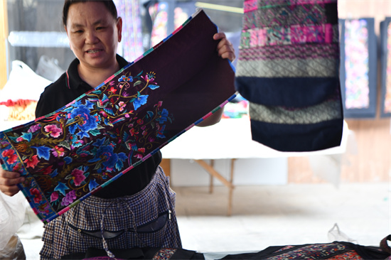 10月2日,一攤主在貴州省凱里市繡里淘非遺集中市展示苗族繡片。(楊仁海 攝)