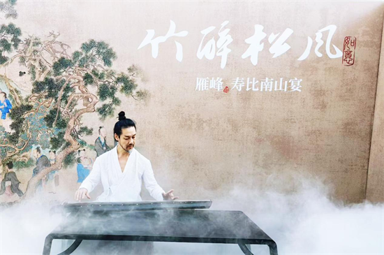 湖南雁峰酒業(yè)品牌總監(jiān)張勇在品鑒會(huì)開場(chǎng)主持詞中表示,白酒作為中華文明的瑰寶,承載著千年的歷史沉淀與文化精髓。雁峰酒,把歷史與文化符號(hào)融入企業(yè)文化與發(fā)展中,傳遞出高雅的藝術(shù)品位和上乘的品質(zhì)品位。品鑒會(huì)“竹醉松風(fēng)”的靈感則來自于宋徽宗的傳世名畫《聽琴圖》,營造了“松風(fēng)煮酒 竹影成詩”的高雅意境,主松主干取自于祝融峰山脈,代表南岳的福,副松主干取自廻雁峰山脈,代表雁峰寺的壽,兩棵松的形狀像兩條在南岳山脈騰飛的龍,寓意“雙龍獻(xiàn)瑞”,借此景祝各位貴賓事事如愿,福壽兩全,在品味白酒的同時(shí)感受衡酒文化的獨(dú)特魅力和深厚底蘊(yùn)。張勇認(rèn)為,一瓶好酒需要時(shí)間沉淀出精華,才能展現(xiàn)最為醇厚的味道。松樹的特點(diǎn)是生長緩慢,氣質(zhì)高雅,這跟雁峰酒的釀造很像,雁峰是一家以“慢”為驕傲的酒廠,讓窖泥自明清以來慢慢生長,形成了湖南省唯一的窖池類文物保護(hù)單位,被譽(yù)為“活著的文物”。同時(shí),把發(fā)酵周期延長至45至60天,讓純糧糟醅和雁峰小窖全面接觸,讓酒香更醇厚,把優(yōu)質(zhì)酒體用淘壇靜置在雁峰中南第一酒窖10至50年,讓酒體老熟生香。這種慢文化,造就了雁峰酒“名貴陳香、醇厚舒適、健康優(yōu)雅”的獨(dú)特口感。
