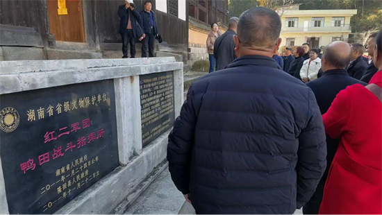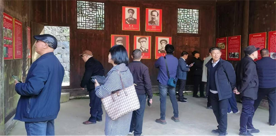 中餐后,金石橋鎮(zhèn)黨委組織委員肖之健陪同兩縣作家參觀了省級愛國主義教育基地紅二軍團賀龍戰(zhàn)斗指揮所。墻壁上張貼著紅軍的英勇事跡讓作家們心情澎湃,武岡市委宣傳部原常務(wù)副部長、作協(xié)主席熊燁動情地說:“走進賀龍戰(zhàn)斗指揮所,厚重的歷史感撲面而來,我們仿佛穿越時空,看到先烈們?yōu)槔硐霋侇^顱、灑熱血的壯烈場景,站在這里,我們深刻體會到紅色基因的珍貴,它不僅是歷史的記憶,更是照亮前路的明燈,作家們要用手中的筆,抒寫和傳承革命先輩的崇高精神,銘記歷史,以紅色精神為動力,在祖國大地上書寫文學(xué)成就。”熊主席的話語深深感染著作家們,他們表示要用心用情寫出有溫度有力量的好作品。在導(dǎo)游田昌桂的引導(dǎo)下,采風(fēng)團隊來到全國文明鄉(xiāng)村典范黃金井村,參觀了百擔(dān)族谷助紅軍的賀氏宗祠、文化長廊、賀學(xué)海“讀書林”、“學(xué)海亭”和“紅軍泉”。作家劉樹忠感慨地說:“金石橋文化底蘊豐厚,鄉(xiāng)村文化的發(fā)展為新時代文明注入了強勁的動力。”離開黃金井村,采風(fēng)車隊爬上海拔1200余米的旅游景點云霧山莊,美麗的亭臺樓閣和如詩如畫的景色令作家們心情愉悅,武岡一位作家朋友說:“ 這里的自然風(fēng)光和天高云淡的生活讓我感覺到了一個世外桃源。”