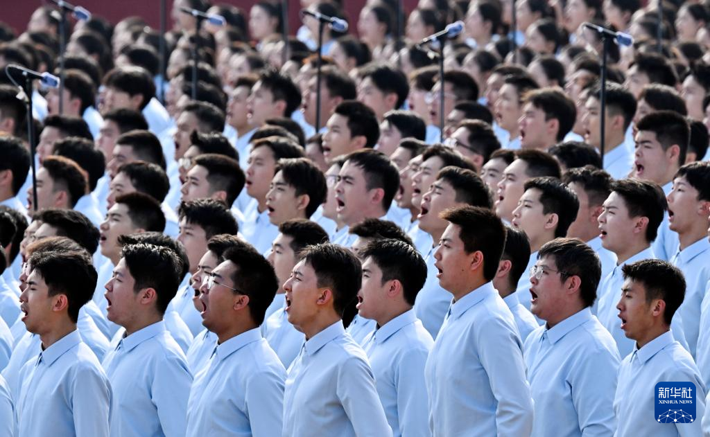 9月3日,紀念中國人民抗日戰(zhàn)爭暨世界反法西斯戰(zhàn)爭勝利80周年大會在北京天安門廣場隆重舉行。這是合唱團在演唱。