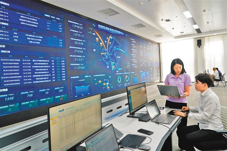 10月10日,位于沙坪壩區(qū)的西部陸海新通道運(yùn)營調(diào)度中心,工作人員在分析數(shù)據(jù)。該運(yùn)營調(diào)度中心大屏實(shí)時(shí)顯示班列訂單、訂艙、開行量等各類數(shù)據(jù)。